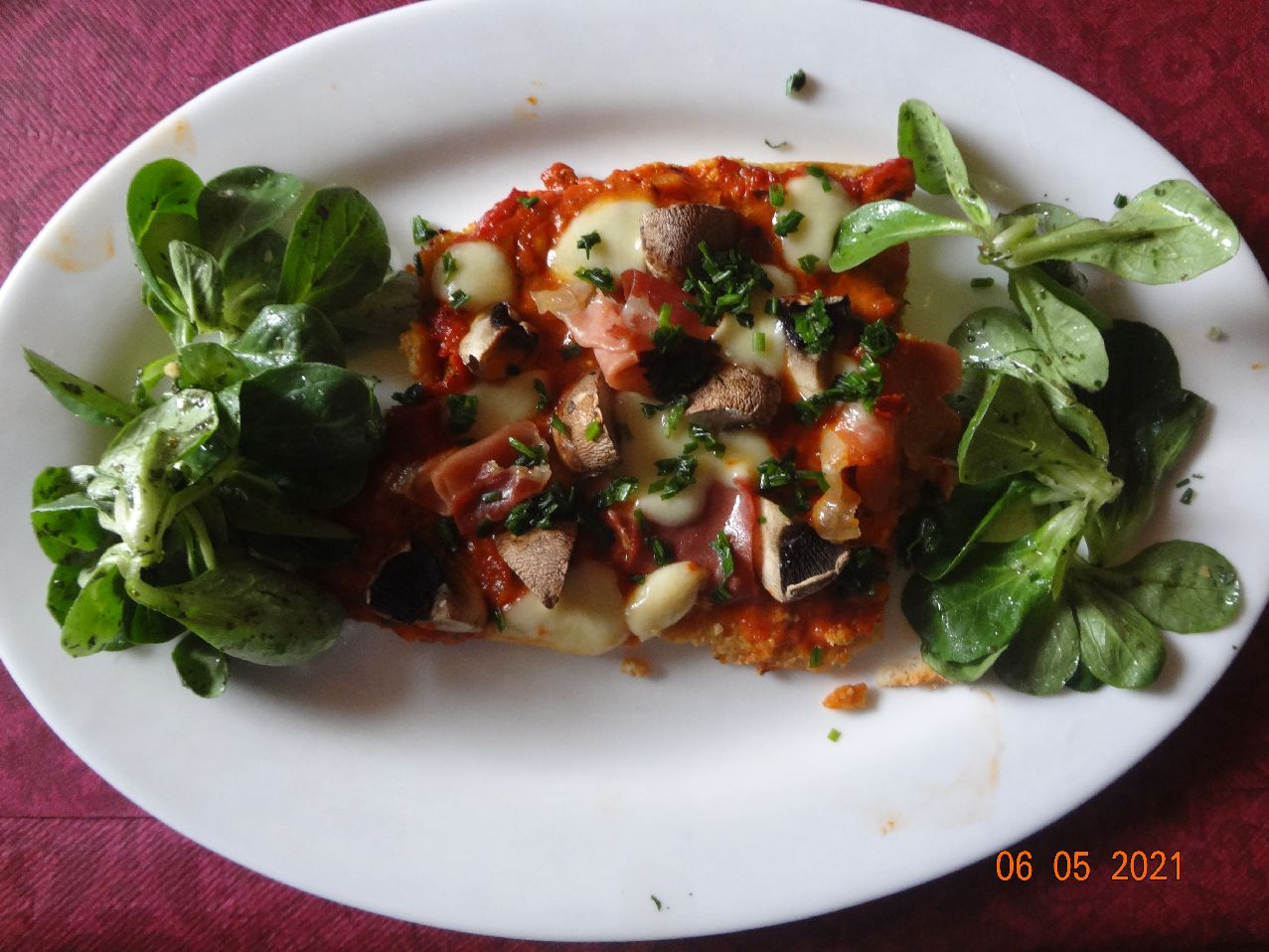 | | Blumenkohl-Pizza mit Pilzen, Feldsalat mit Sprossen |