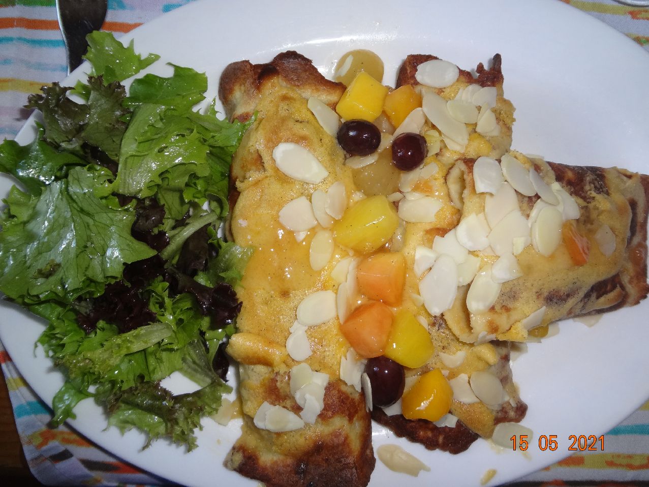 | | Früchte-Crepes mit Savajone, Salatrio |