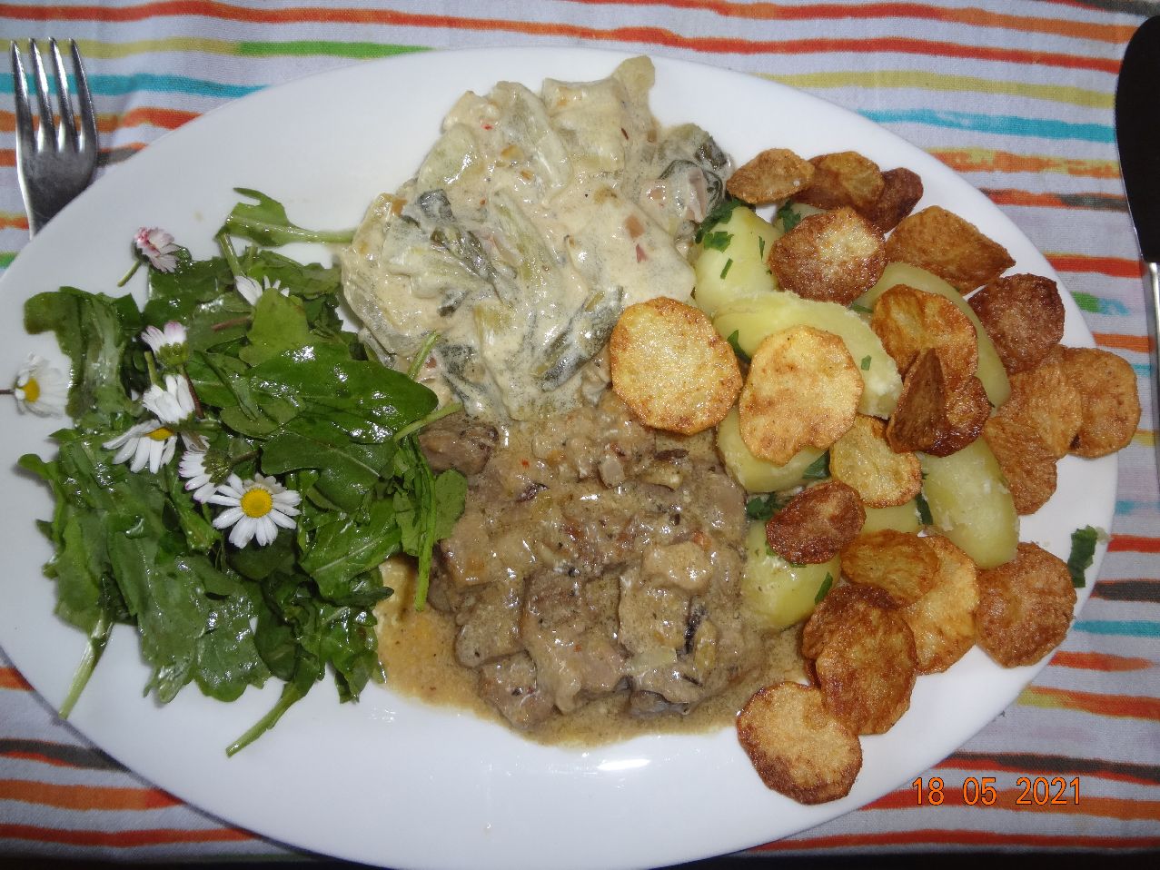 | | Geräucherte Hähnchen-Schenkel in Champignon-Pilz-Soße mit Tagliatelle, Spargel-Salat |