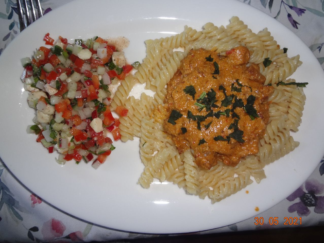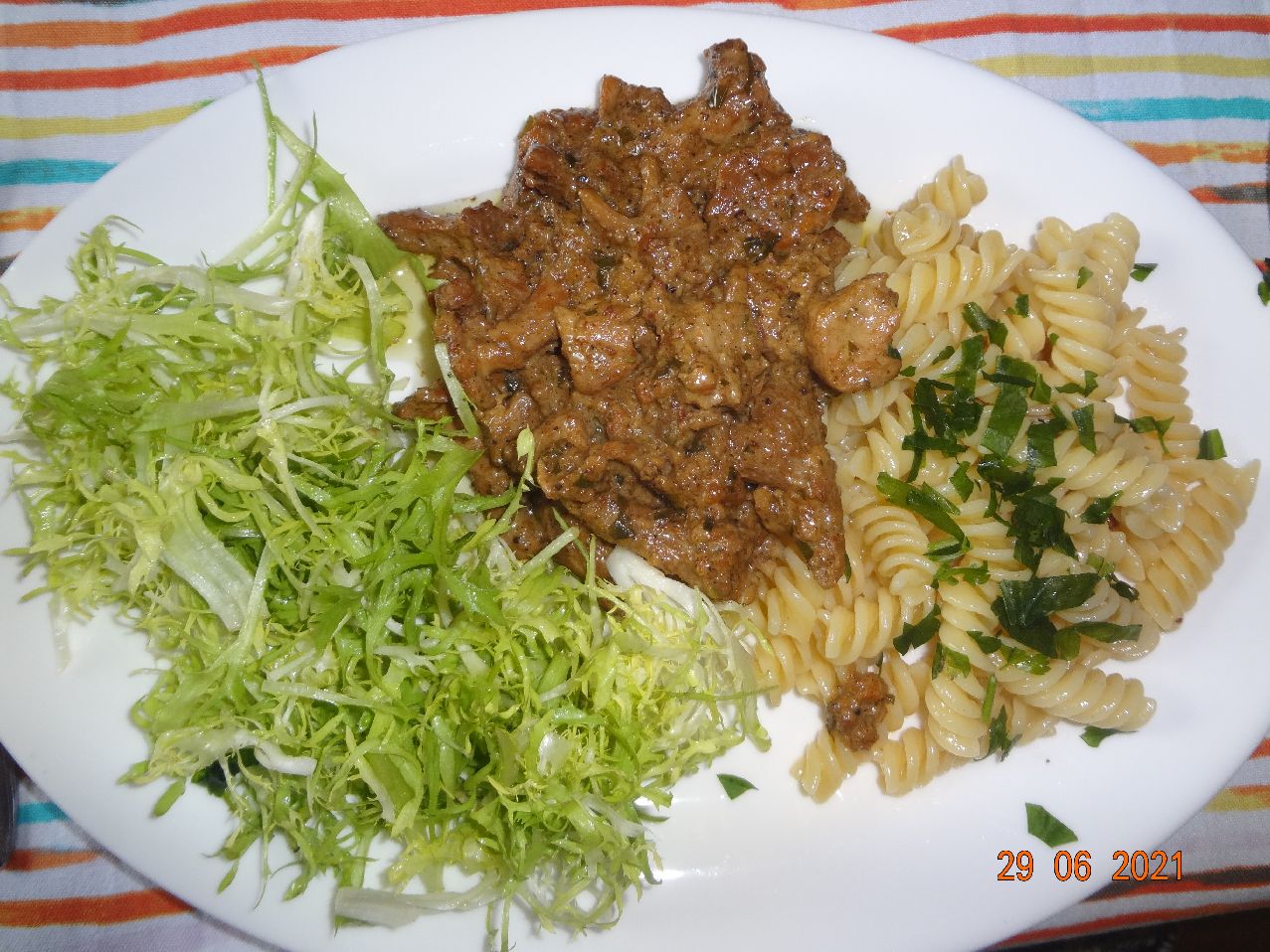 | | Geschnetzeltes vom Schweine-Filet in Tomaten-Soße mit Käse-Taglatelle, Eisbergsalat |