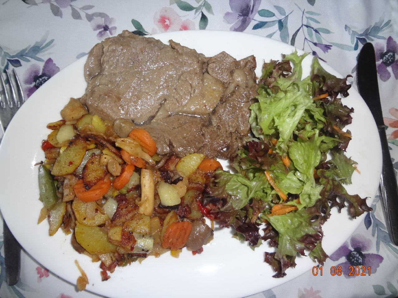 Entrecôte, Bratkartoffeln mit gemischtem Gemüse, Kiwi, Lollo-Rosso-Salat mit Möhren-Streifen |