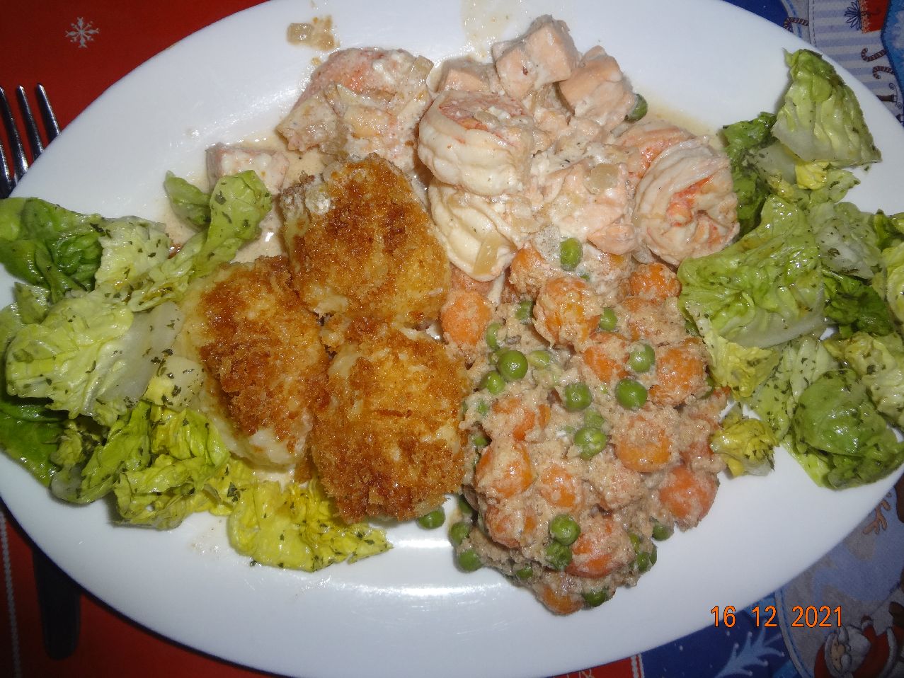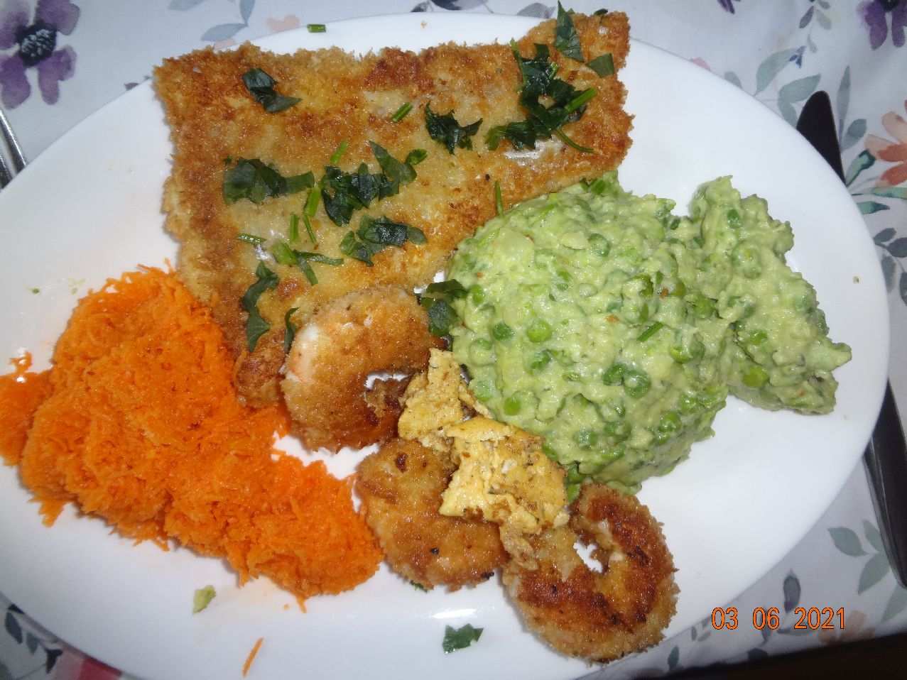 | | Paniertes Kabeljau-Filet, panierte Garnelen, Kartoffel-Erbsen-Stampf, Möhrensalat |