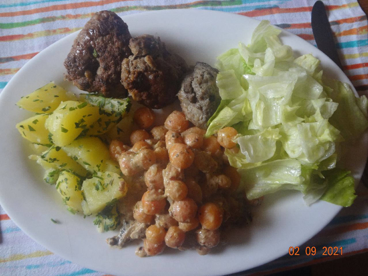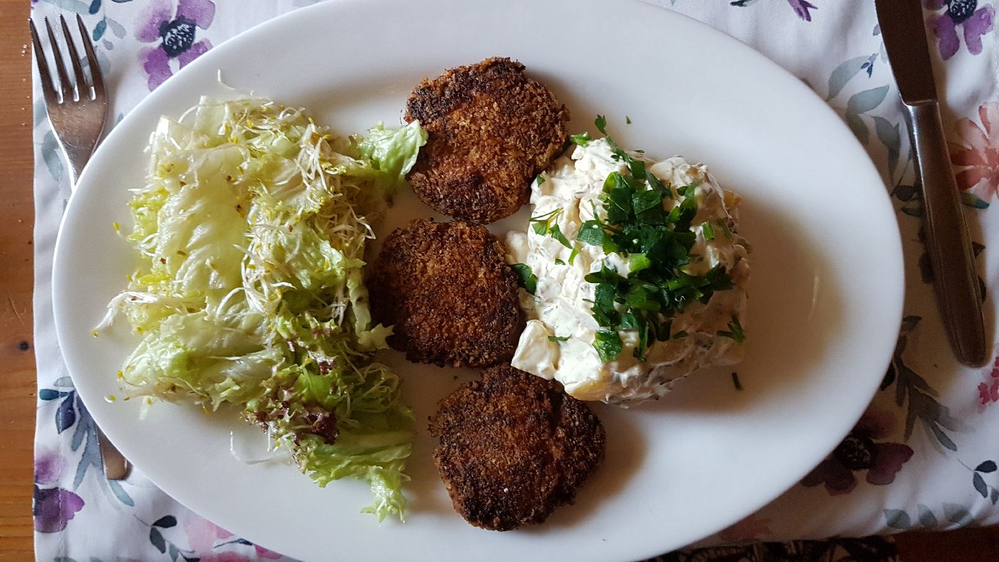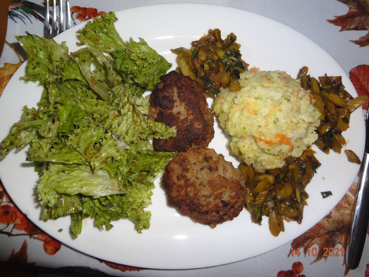 | | Kartoffel-Salat mit selbstgemachter Remoulade, Frikadellen vom Reh-Filet, Lollo-Rosso-Salat mit Sprossen |