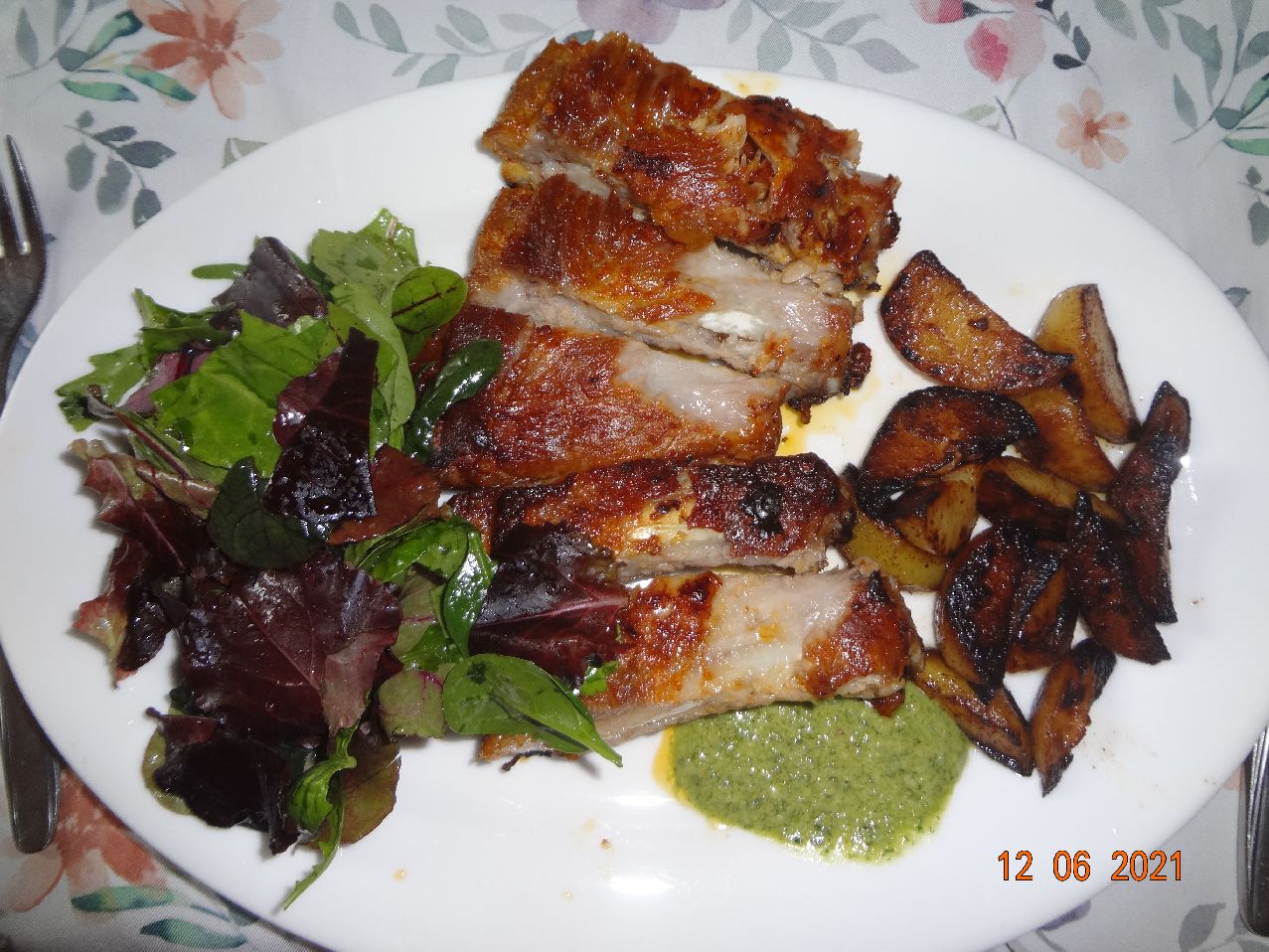 | | Spareribs mit Kartoffel-Ecken, Kräuter-Dip, Wildkräuter-Salat |