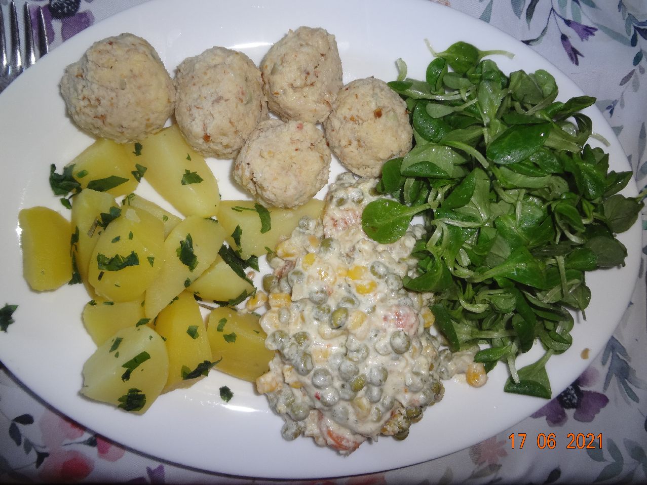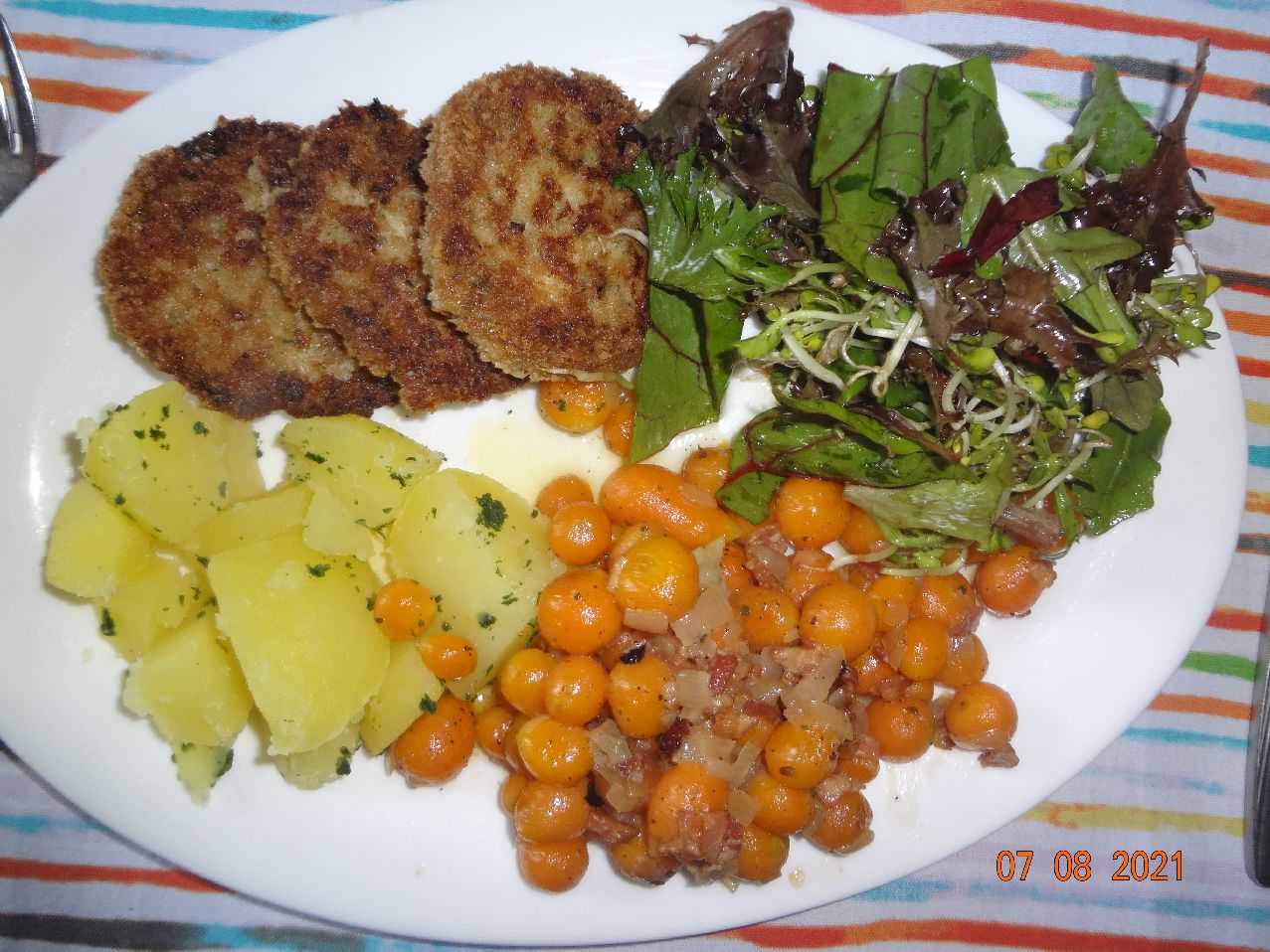 | | Fisch-Frikadellen mit Pariser Möhren, Pet.-Kart., Pflücksalat mit Sprossen |