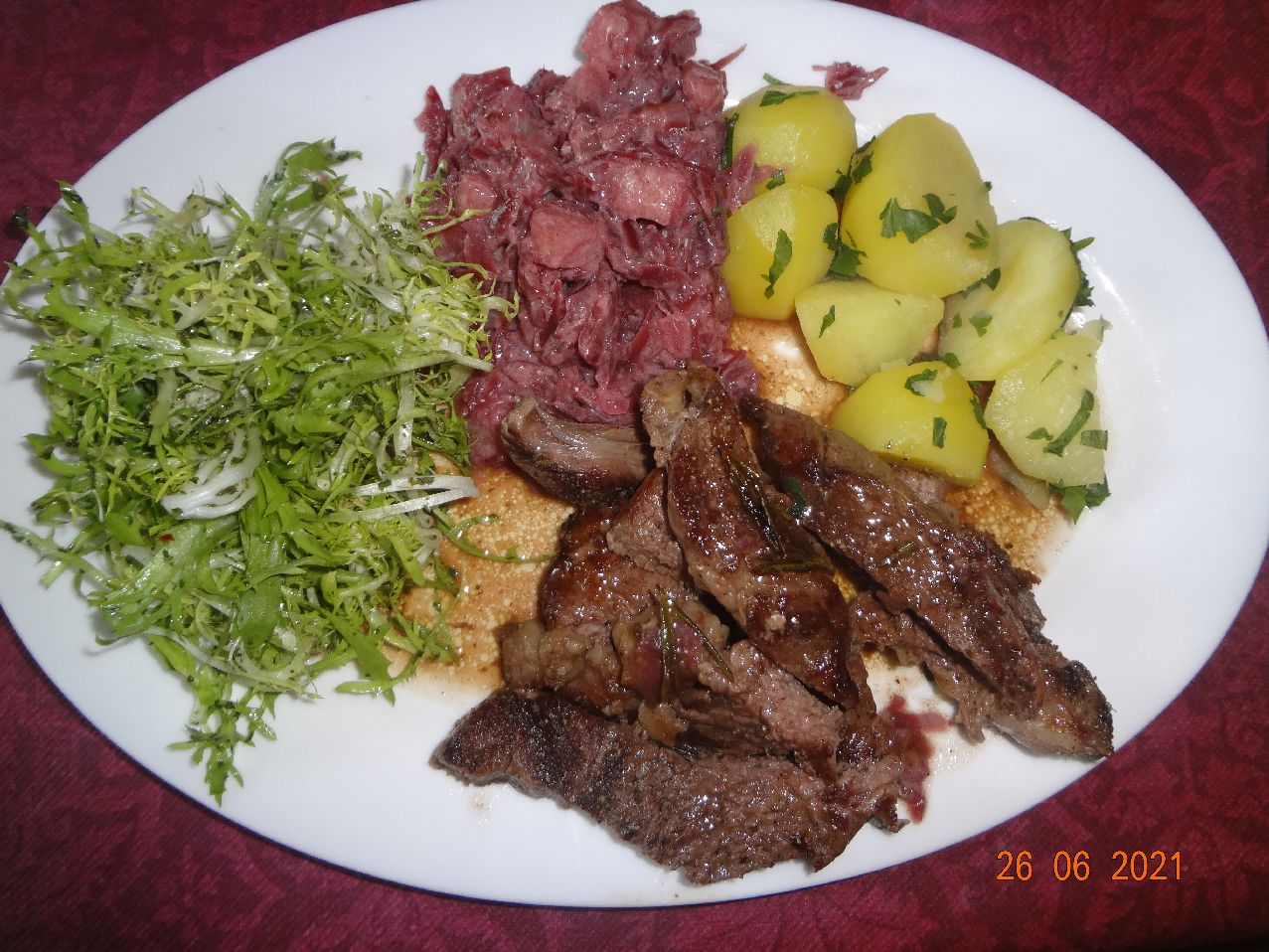 | | Rinder-Nacken-Steak mit Apfel-Rotkohl, Pet.-Kart., Frisée-Salat mit Kräutern |