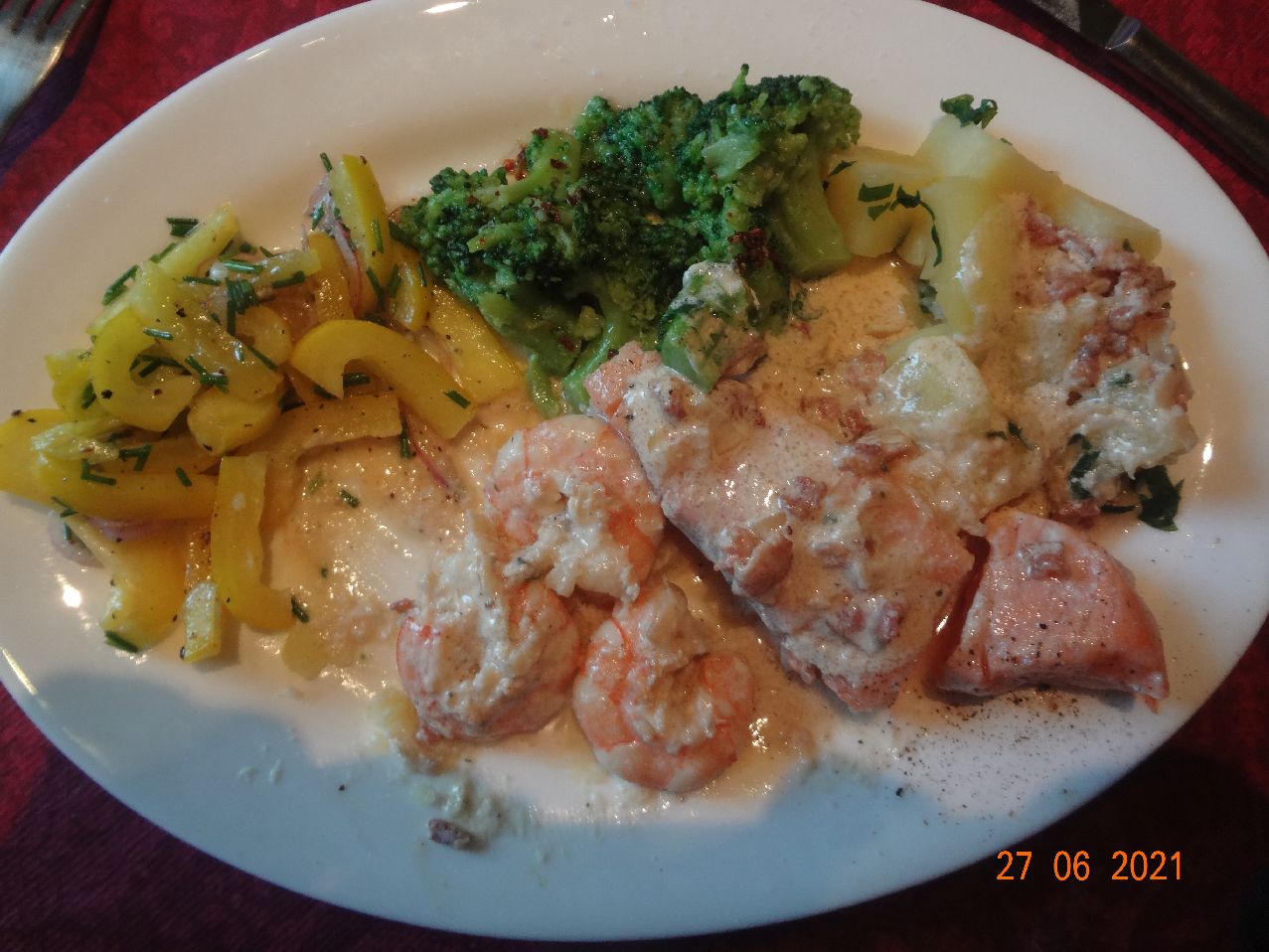 | | Vakuumgegartes Lachs-Filet, Garnelen in Wein-Rahm-Soße mit Brokkoli, Pet.-Kart., Paprika-Salat |