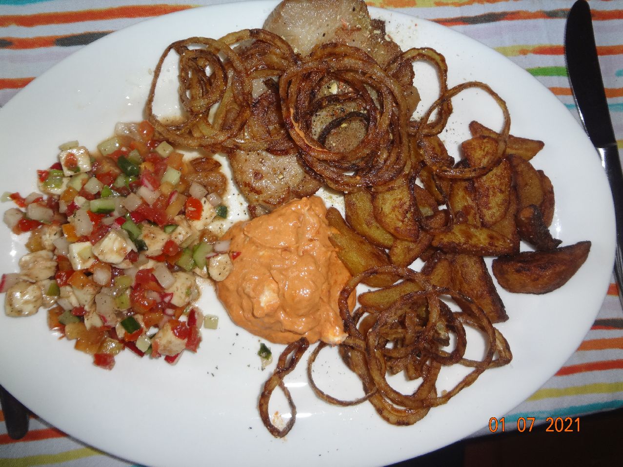 Vakuumgegartes Duroc-Steak, fritierte Kartoffel-Spalten, fritierte Zwiebeln, Ajvar-Tomaten-Schmand-Dip, Gemüse-Salat mit Mozzarella |
