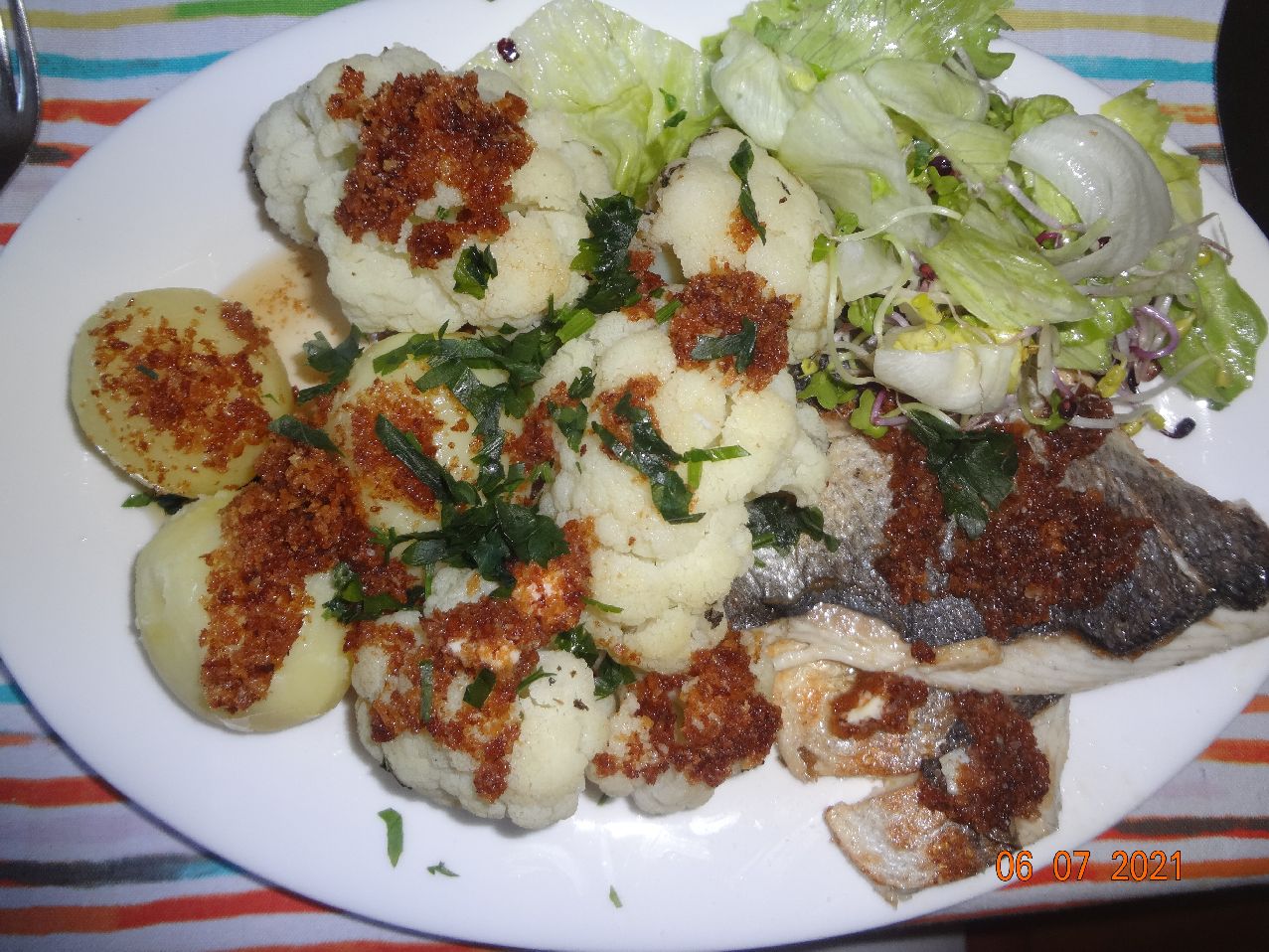 | | Gebratene Doraden-Filets, gedünsteter Blumenkohl, Frühkartoffeln, geröstete Panko-Brösel, Eisbergsalat mit dreierlei Sprossen |