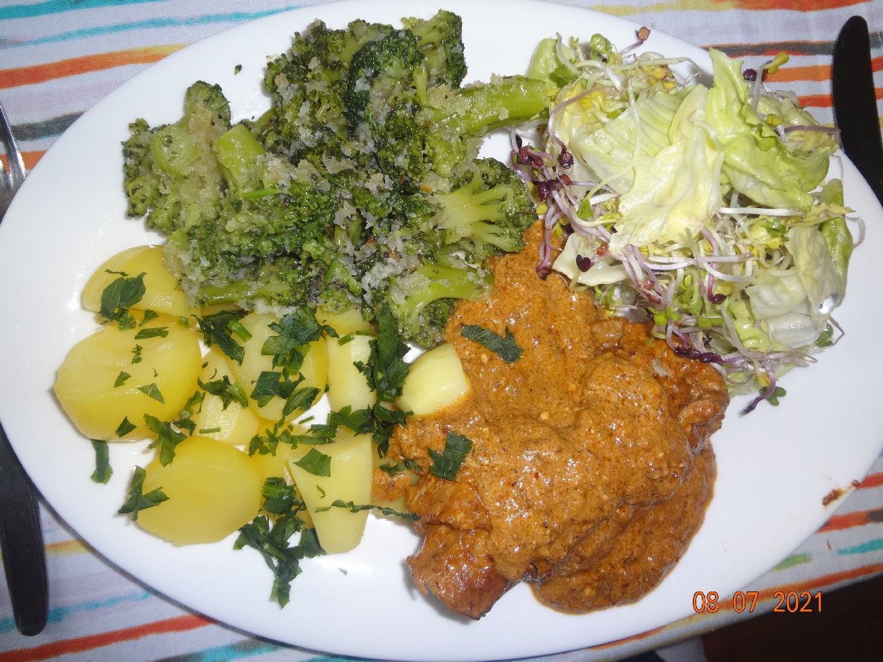 | | Rinder-Gulasch in Steinpilz-Schmand-Soße, Möhren-Blumenkohl-Brokkoli-Gemüse Crispana-Salat mit Dattel-Balsam |