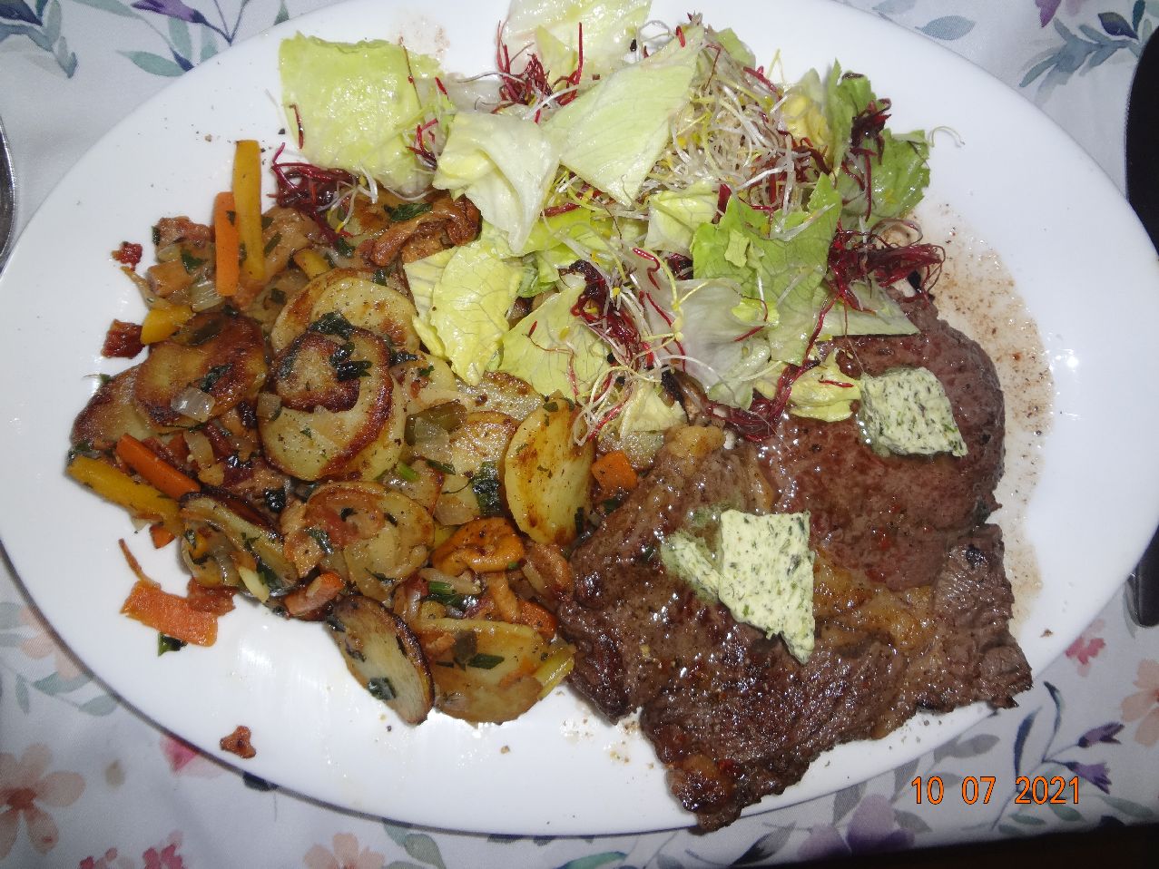| | Entrecôte mit Kräuterbutter, Pak Choi mit Pinien-Kernen, fritierte Kartoffel-Spalten mit fritierten Zwiebeln, Wildkräuter-Salat mit Sprossen in Curryöl |