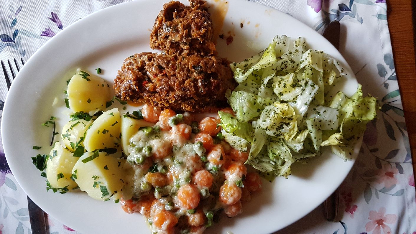 | | Hackbraten, Pariser Möhren mit Erbsen in Wein-Rahm-Soße, Pet.-Kart., Eisbergsalat mit Kräutern |
