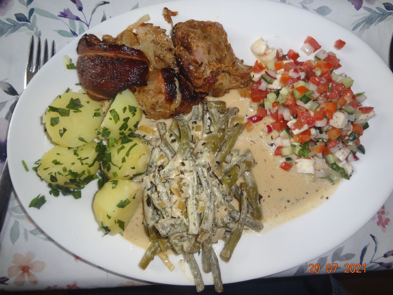 | | Gegrillter Gyros-Braten, grüne Bohnen in Sekt-Schmand-Joghurt-Soße, Pet.-Kart., Gemüse-Salat mit Mozzarella |