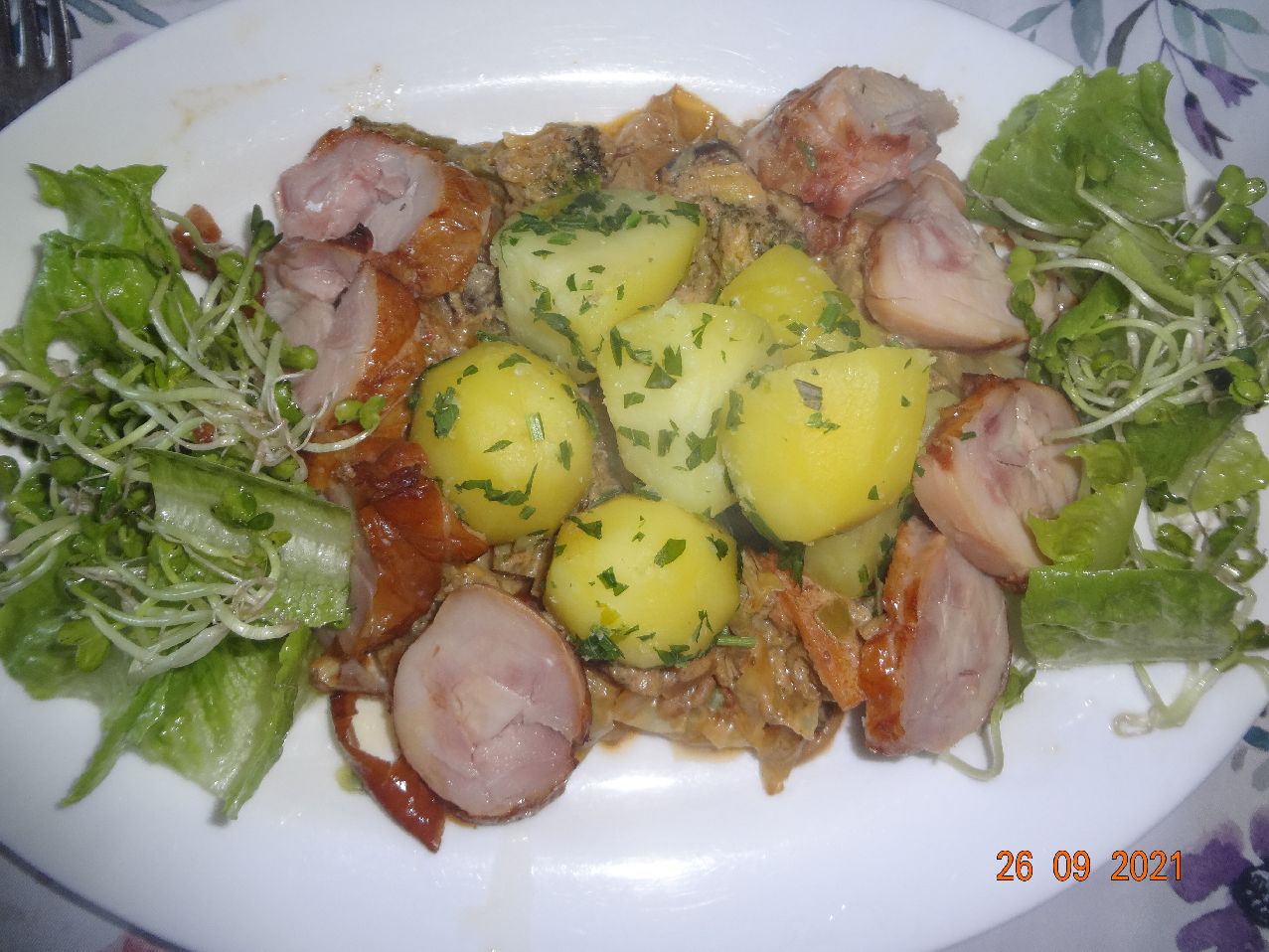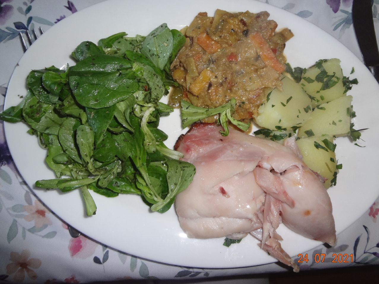 | | Geräucherte Hähnchen-Schenkel, Asia-Gemüse, Pet.-Kart., Feldsalat mit Kräutern |