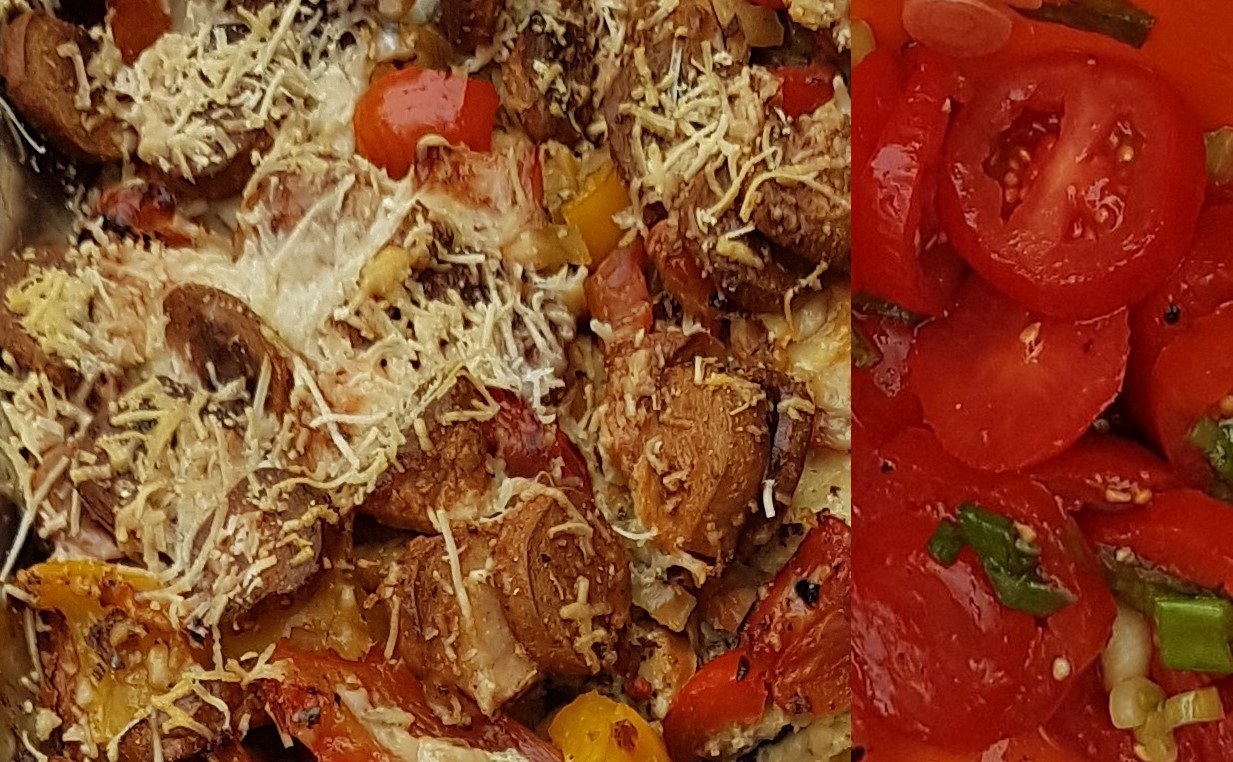 | | Paprika-Auberginen-Auflauf mit Veggi-Curry-Würstchen, Tomaten-Salat |