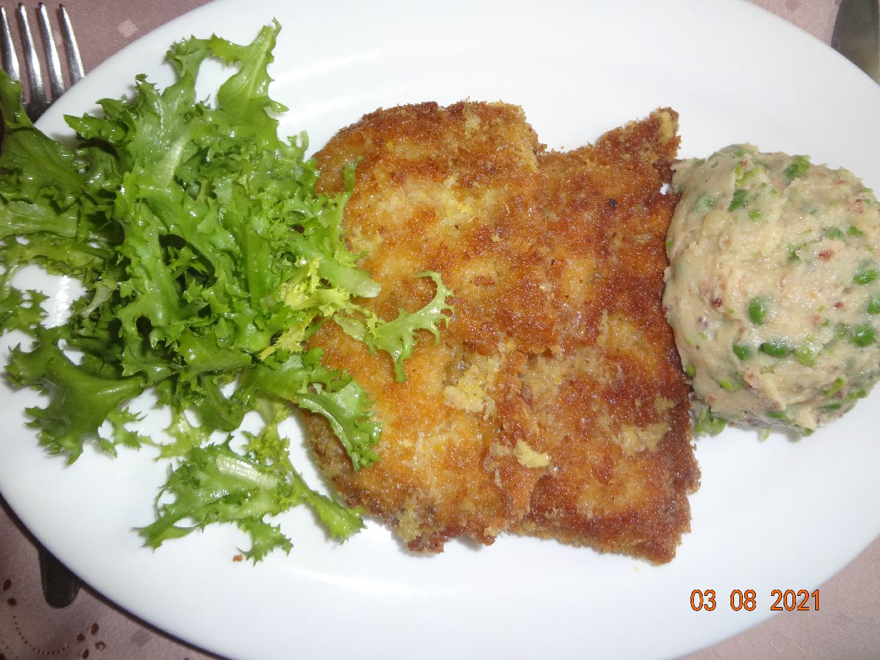 | | Hähnchen-Schnitzel, Erbsen-Kartoffel-Püree, Frisée-Salat |