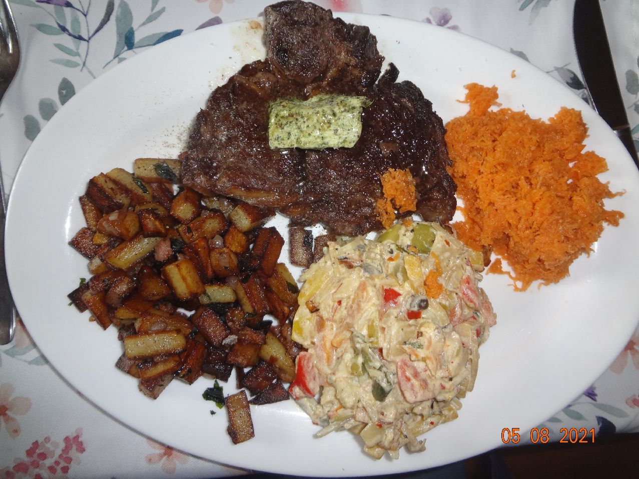 | | Entrecôte, Röstkartoffel-Würfel, Asia-Gemüse mit Sekt-Schmand-Soße, Möhrensalat |