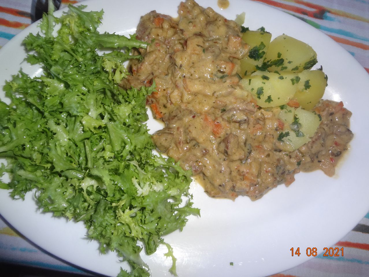 | | Lamm-Gulasch in Schmand-Sekt-Soße, Pet.-Kart., Frisée-Salat |