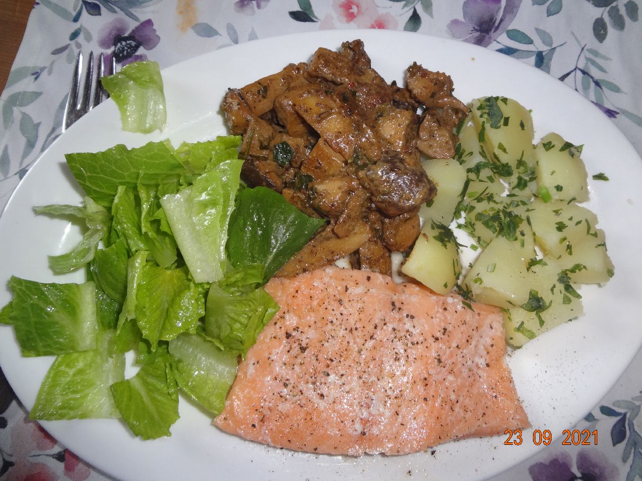 | | Vakuumgegartes Lachs-Filet mit Kräuter-Seiblingen in Steinpilz-Soße, Pet.-Kart., Crunchy-Salat |