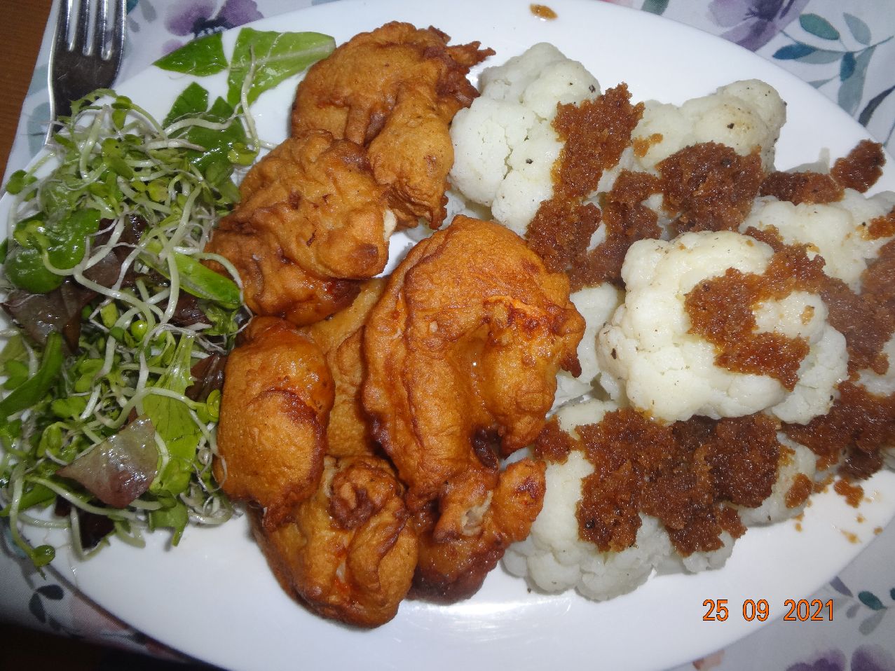 | | Garnelen im Schlafrock, gedämpfter Blumenkohl mit Panko-Bröseln, gemischter Salat mit Sprossen |