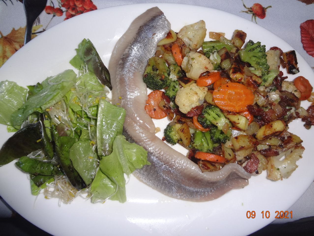 | | Eingelegter Brathering mit Röstkartoffel-Würfeln, Asia-Gemüse, Feldsalat |