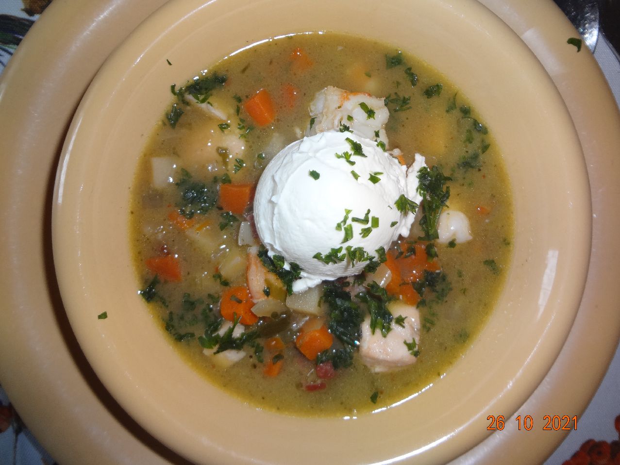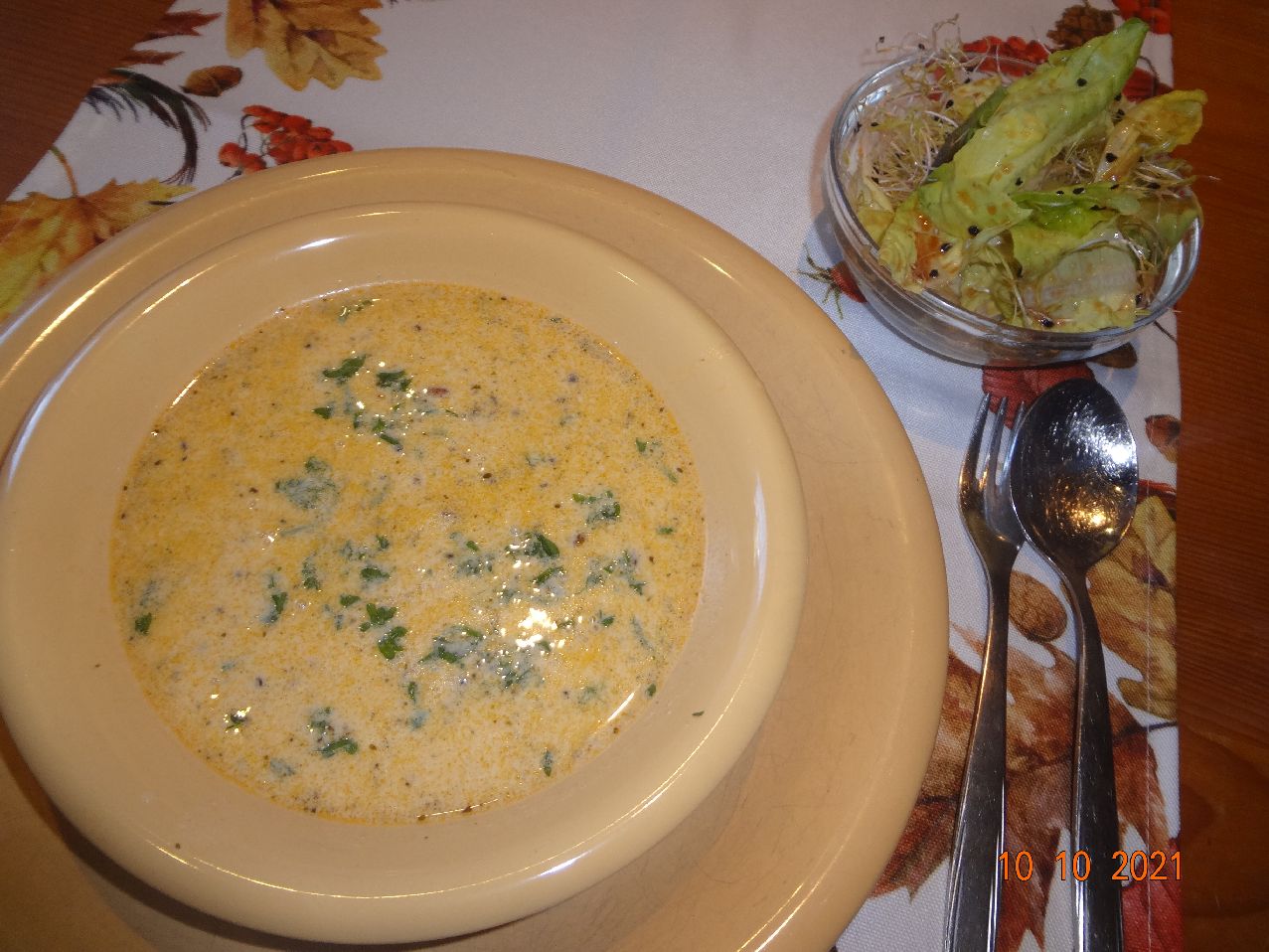 | | Gemüse-Suppe mit Lachs, Garnelen, Gemüse-Salat mit Mozzarella |