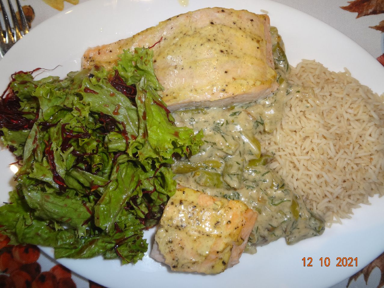 | | Lachs-Würfel in Sekt-Rahm-Soße, gemischtes Gemüse, Tagliatelle, Salatherzen mit Kräuter-Joghurt-Zitrone-Dressing |