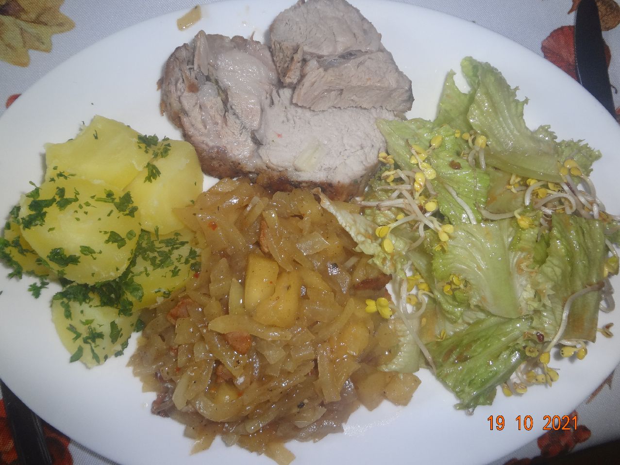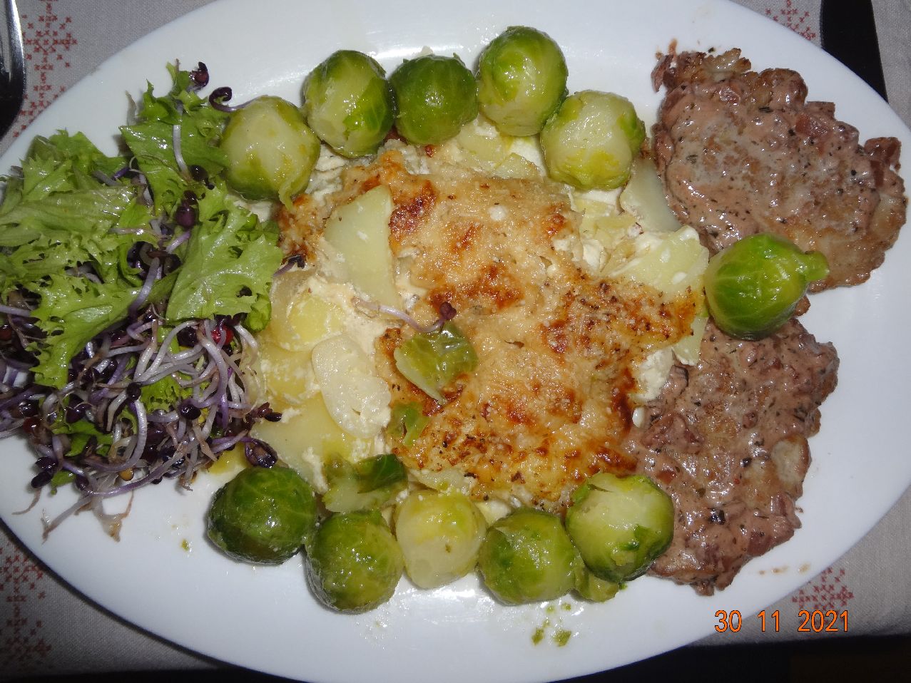 | | Gebratenes Schweine-Filet mit Rosenkohl, Kartoffel-Gratin, Frisée-Salat mit Radieschen-Sprossen in Feigensenf-Marinade |