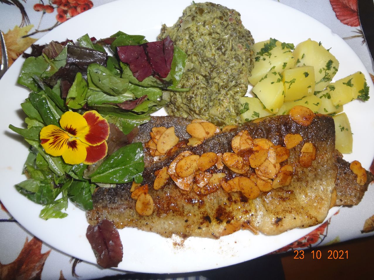 | | Lachs-Forellen-Filet Müllerin mit Mandel-Nuß-Butter, Spinat, Pet.-Kart., Salat-Mix mit Blüte, Dattel-Balsam |