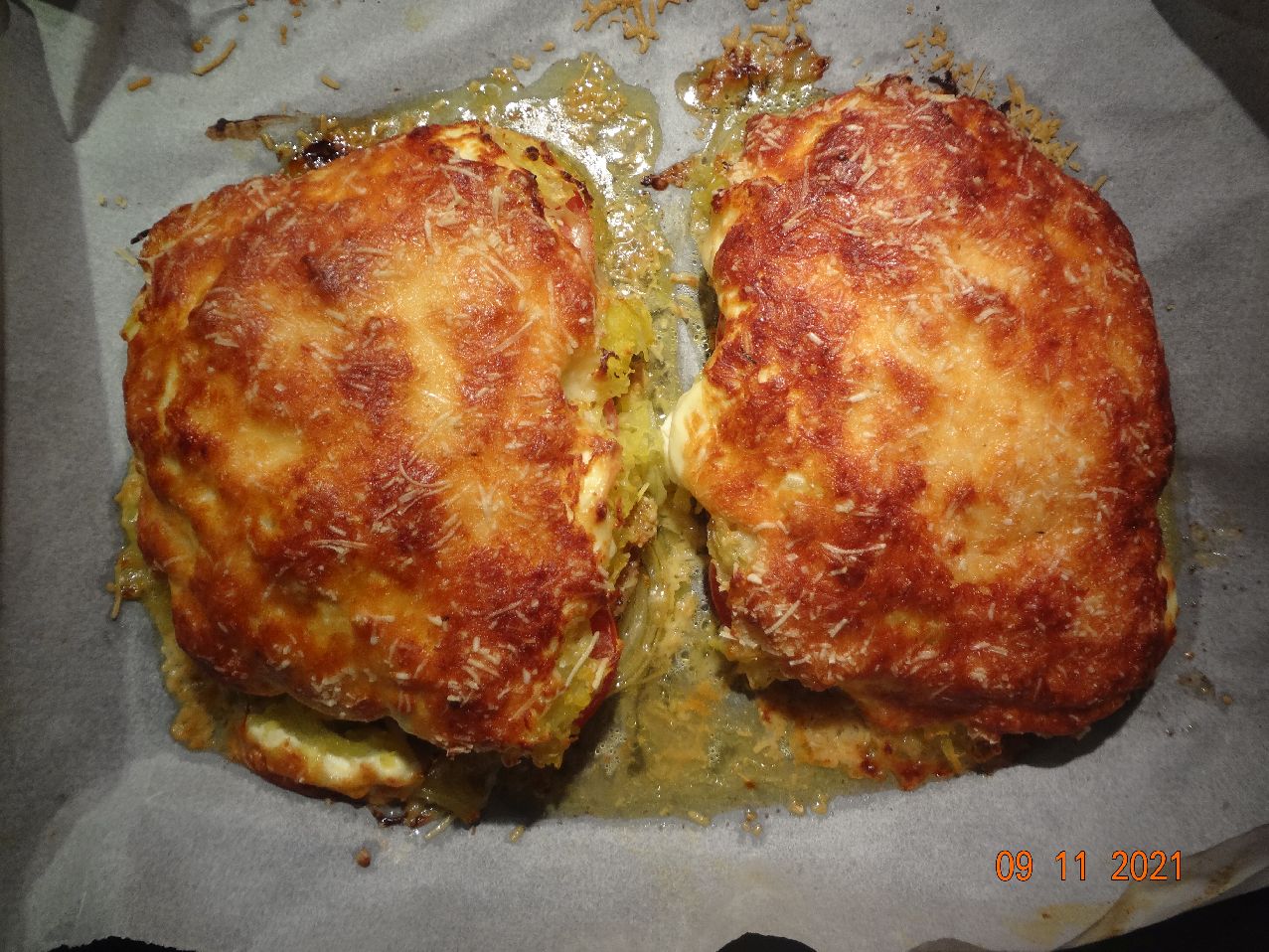 | | Filetierte Hähnchen-Schenkel auf Zwiebel-Scheiben unter einem Dach aus Tomaten-Scheiben, Kartoffel-Raspeln, Schmand, Parmesan |