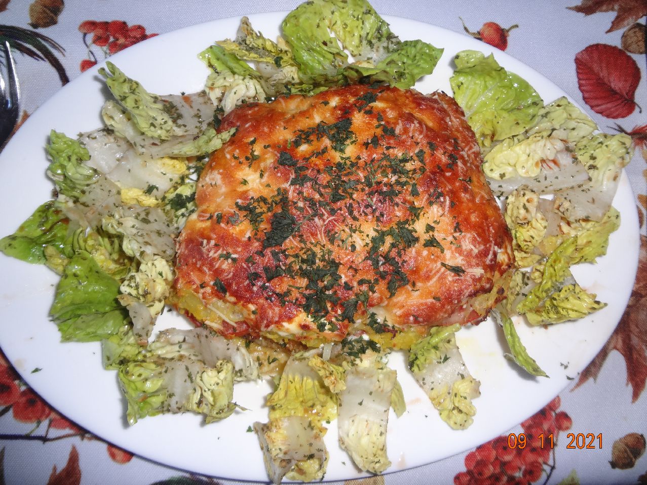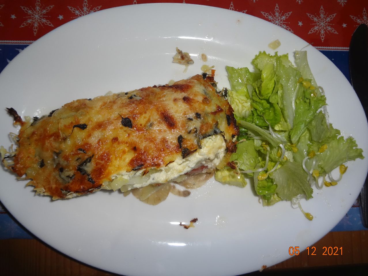 | | Auflauf mit Schweine-Filet, Tomaten, Kartoffeln, Salat mit Porree-Sprossen in Limonenöl |