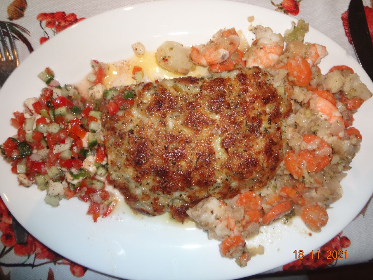 | | Schlemmer-Filet a la Bordelaise (Wolfsbarsch, Lachs), Mischgemüse mit Garnelen, Gemüse-Salat mit Mozzarella |