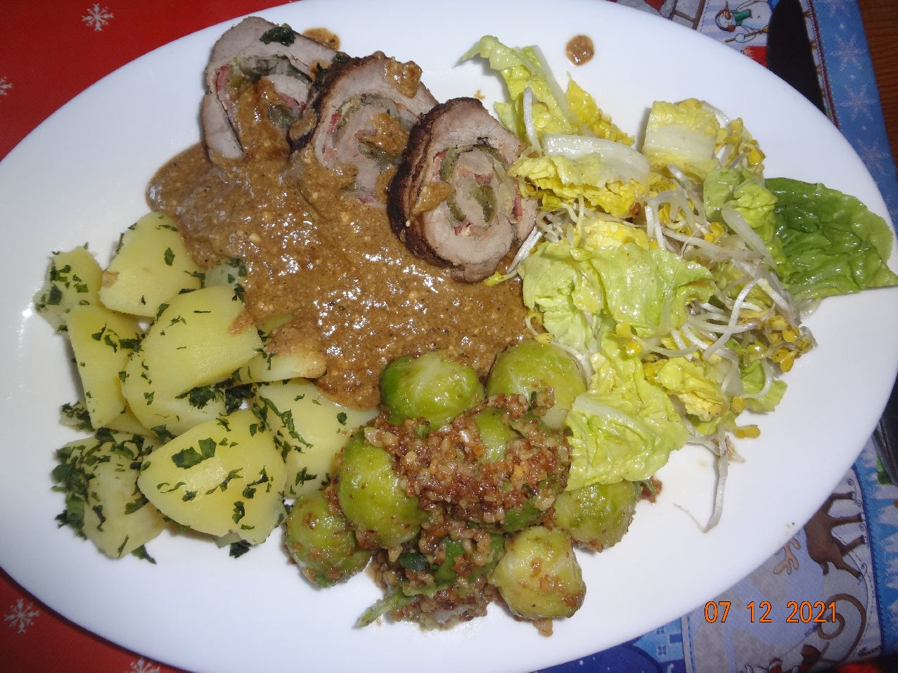 | | Rouladen aus Wildschein-Rücken in Wild-Rahm-Soße, Rosenkohl mit gerösteten Pinienkernen, Pet.-Kart., Salatherzen mit Sprossen in Feigensenf-Balsam |