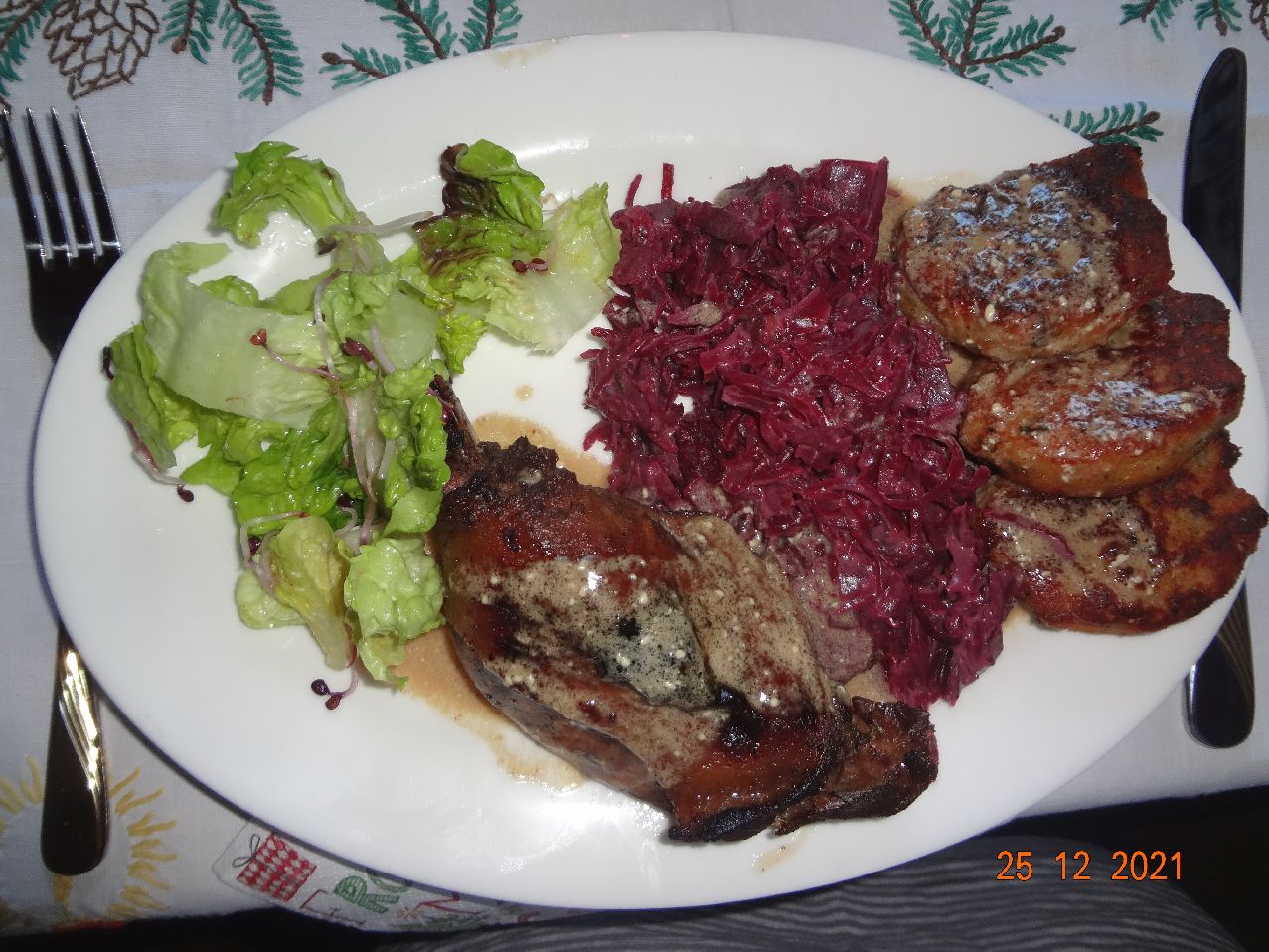 | | Gänse-Keulen (8) mit Rotkohl, Semmelknödeln, Salatherzen mit Radieschen-Sprossen, Feigenbalsam, vorher Spargelsuppe |