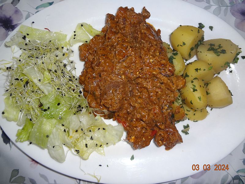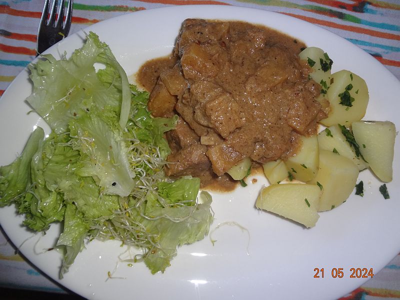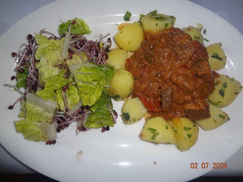 Kalb-Gulasch mit 17 Zutaten, Thymian-Pet.-Kart., Eisbergsalat mit Sprossen |