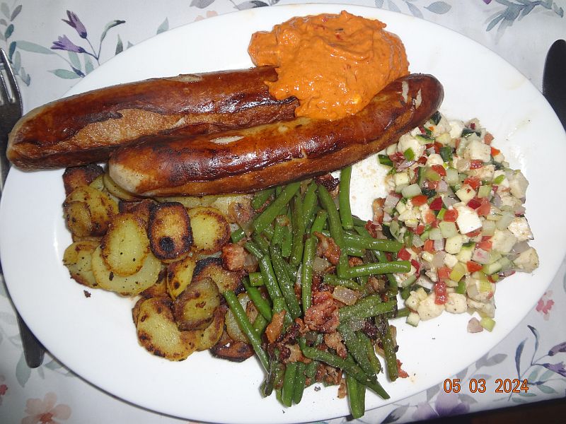 | | Thüringer Rostbratwürste, grüne(*) Bohnen in Speck und Zwiebeln, Bratkartoffeln, Gemüse-Mozzarella-Salat |