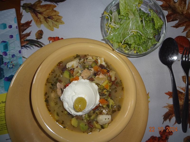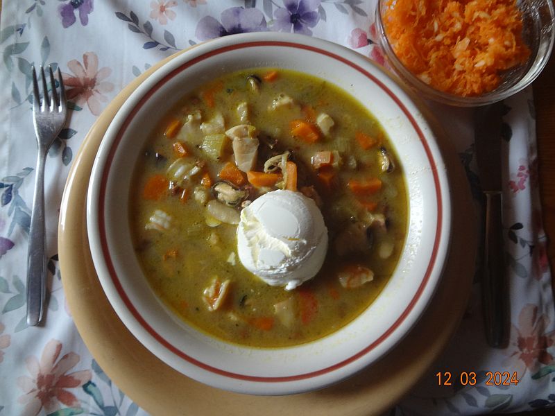 | | Suppe aus Fisch, Garnelen, Meeresfrüchten und Mischgemüse, Möhrensalat mit Apfel |