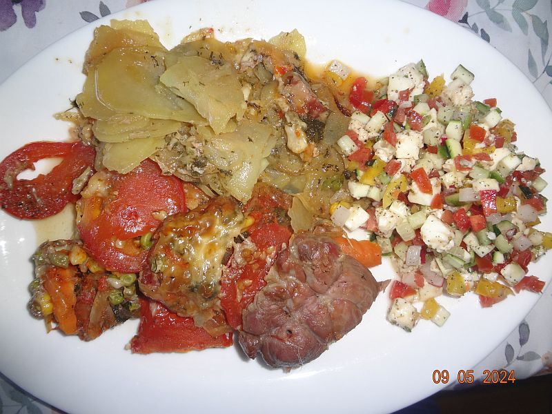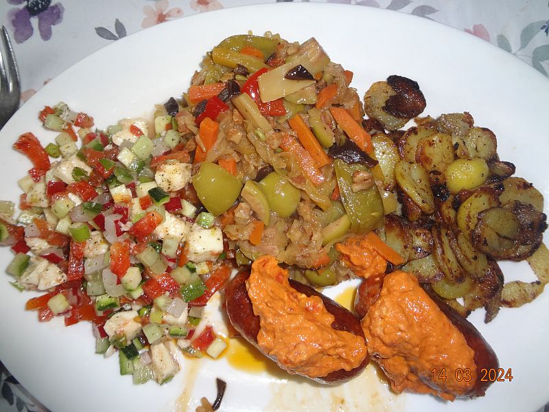 | | Salsiccia mit hh-Pesto, Asia-Gemüse mit Oliven, Bratkartoffeln, Gemüse-Mozzarella-Salat |