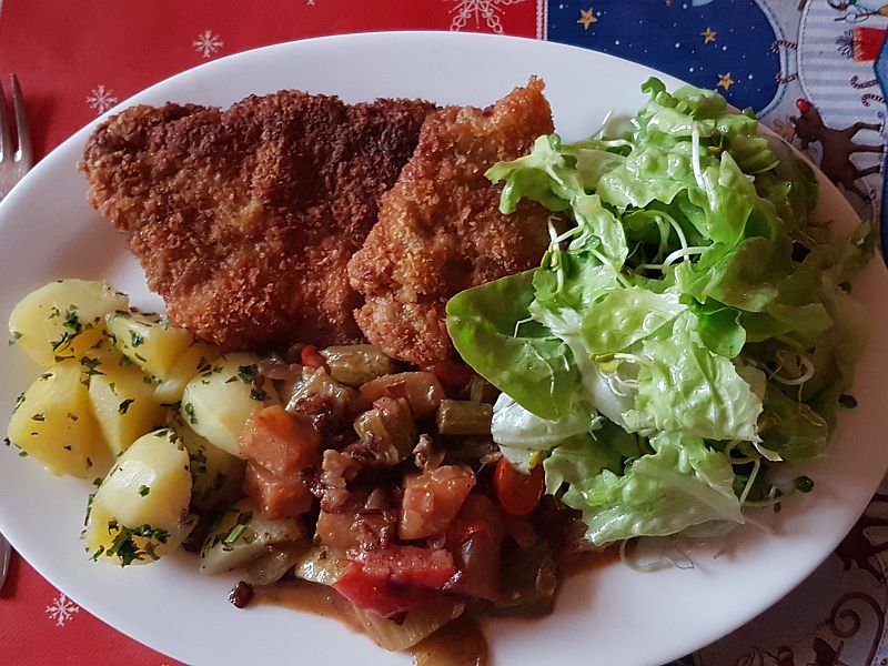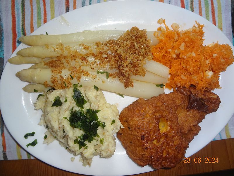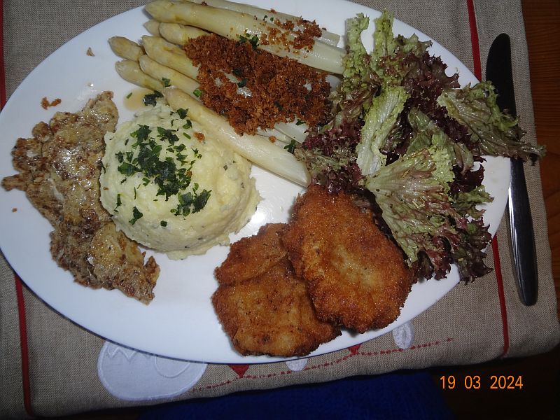 | | Wiener Schnitzel, Spargel mit Panko-Bröseln(*), Kartoffel-Pastinaken-Stampf, Lollo-Rosso-Salat mit Kräutern |