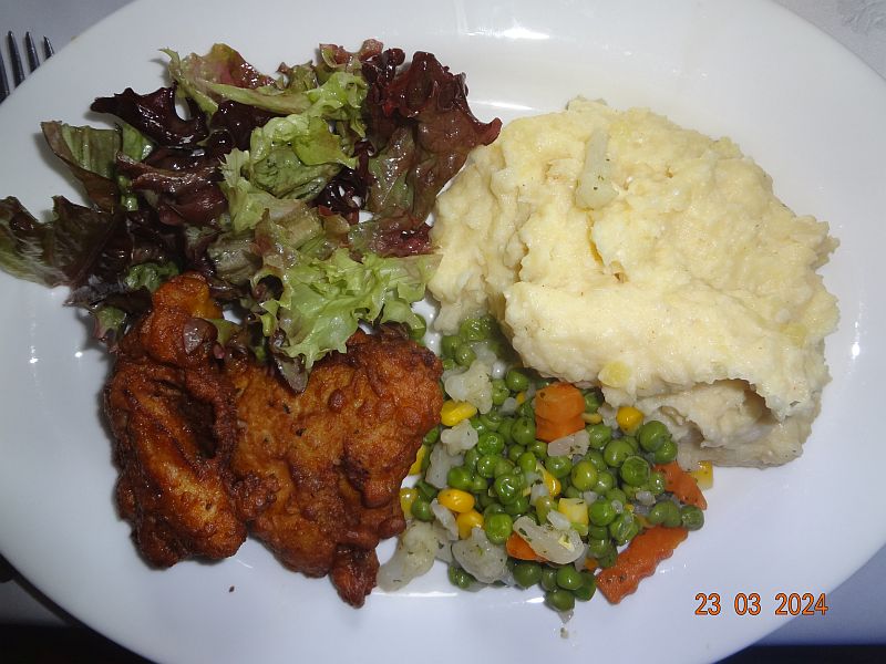 | | Fritierte, filetierte Schälrippchen, Mischgemüse mit Sekt-Rahm-Soße, gebutterte Pet.-Kart., Eichblattsalat mit China-Rose-Sprossen |