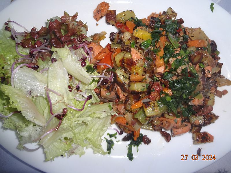 | | Würfel-Bratkartoffeln mit Lachs und Gemüse, Lollo-Rosso-Salat mit Sprossen |