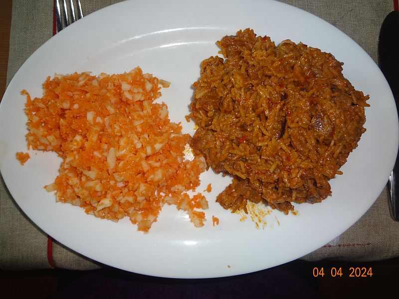 | | Paella gemischt mit Ragu alla bolognese, Eisberg-Salat mit Sprossen |