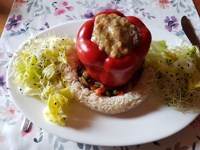 | | Mit Rinderhackfleisch gefüllte Paprikaschote, Reisring mit innenliegendem Mischgemüse, Endivien-Salat mit Alfalfa-Sprossen |