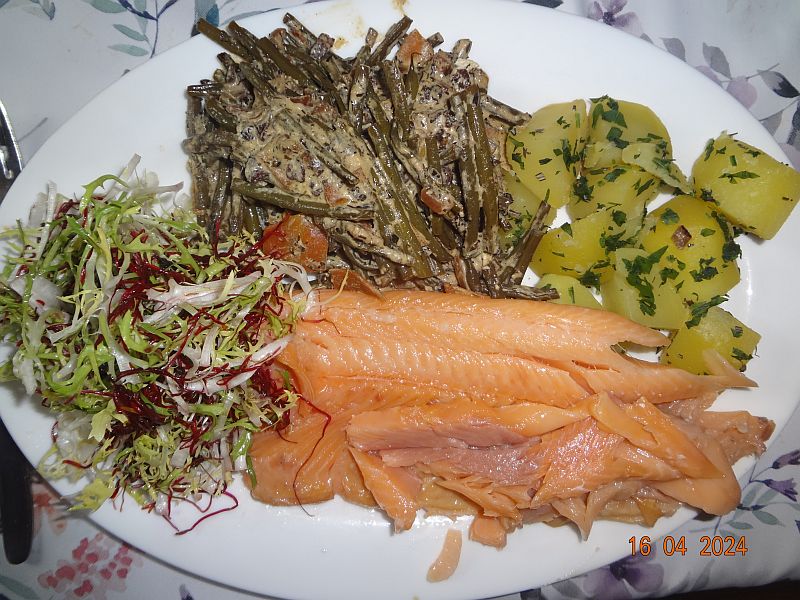 | | Geräucherte Forelle, grüne Bohnen mit Möhren-Julien, Pet.-Kart., Frisée-Salat mit Rote-Bete-Sprossen |
