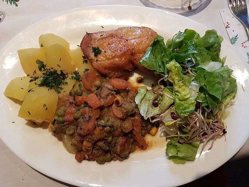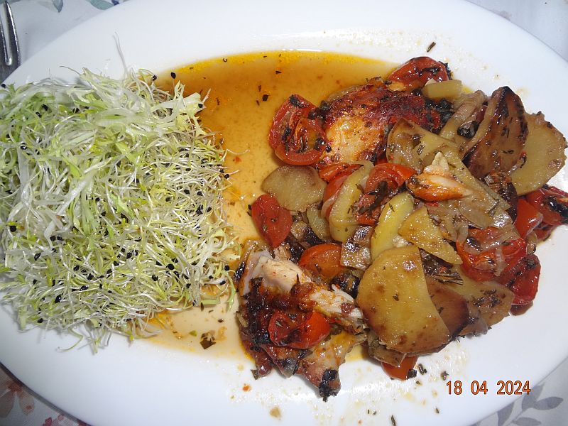 | | Selbstgeräucherte Hähnchenschenkel mit Kart.-Gemüse-Gratin, Lollo-Bionda-Salat mit Rote-Bete-Sprossen |