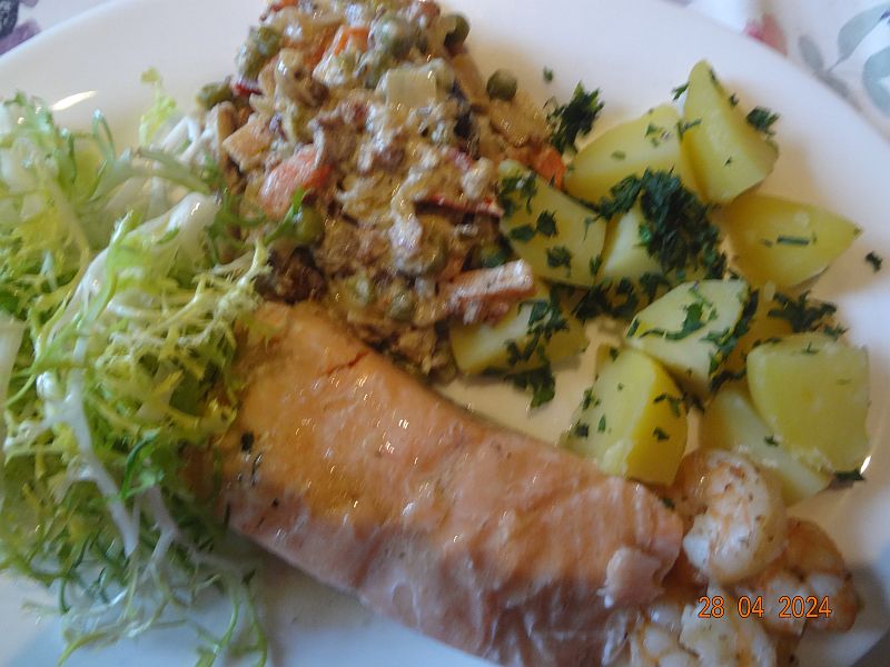 | | Rotbarsch-Filet im Schlafrock, Leipziger Allerlei, Kartoffelstampf, Lollo-Rosso-Salat mit Ahornsirup, Zitronensaft, Leinöl |