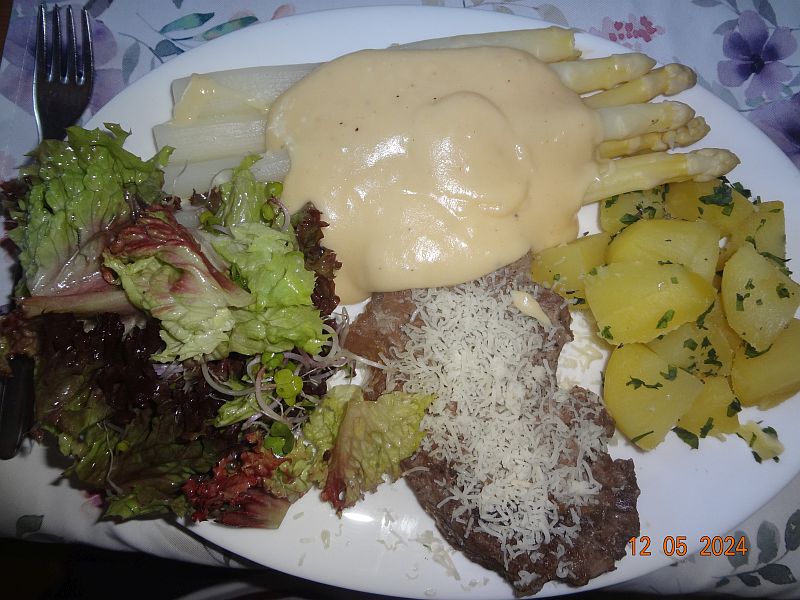 | | Nackensteak, Spargel mit Bechamel-Soße, Pet.-Kart., Lollo-Rosso-Salat |