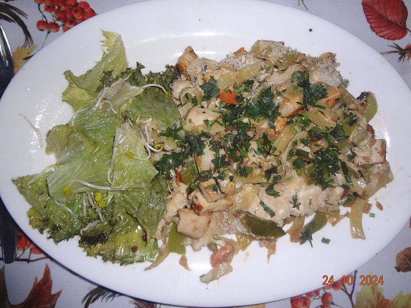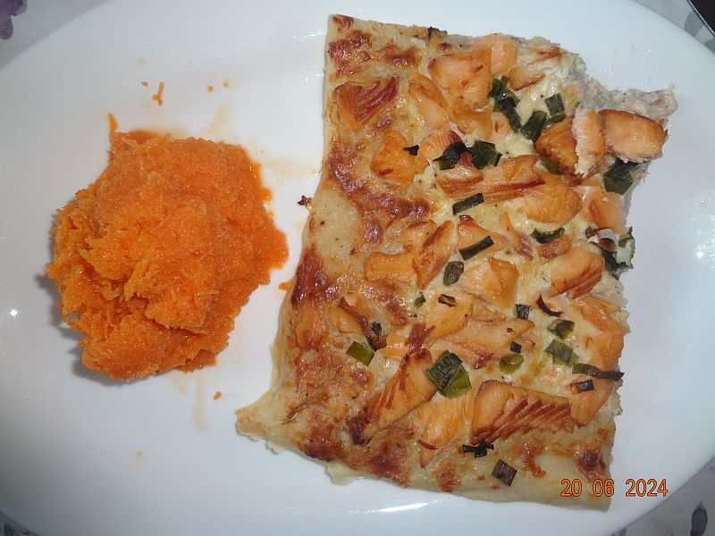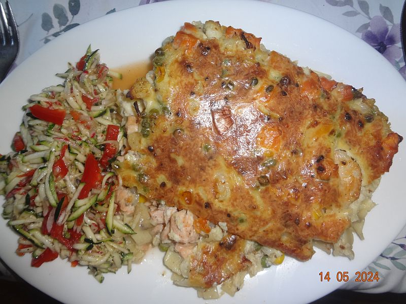 | | Auflauf mit Tagliatelle, Lachs, Garnelen, Mischgemüse und Ei-Schmand-Käse-Soße, Zucchini-Salat mit Radieschen und Paprika |
