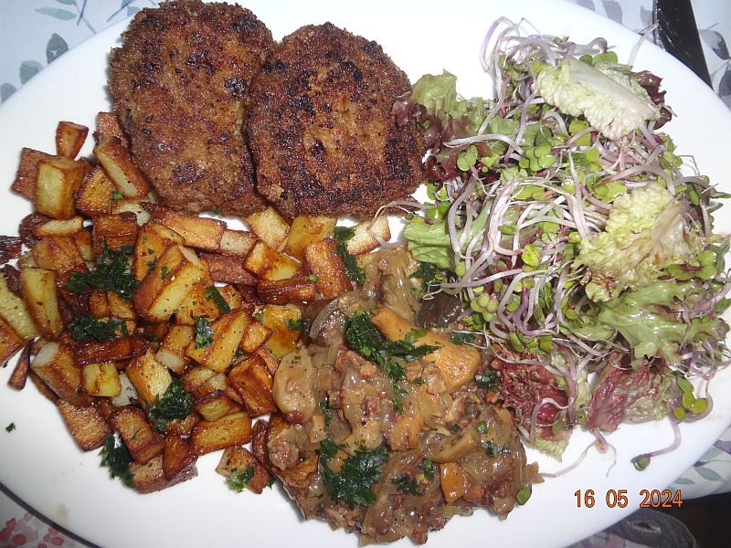 | | Bouletten, Würfelbratkartoffeln mit Waldpilzen, Lollo-Rosso-Salat mit China-Rose-Sprossen |
