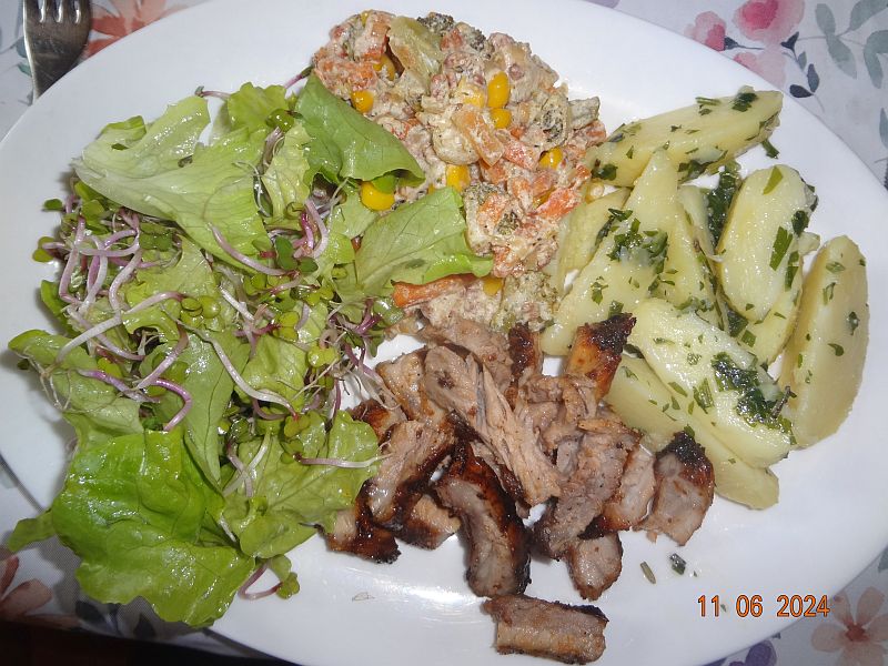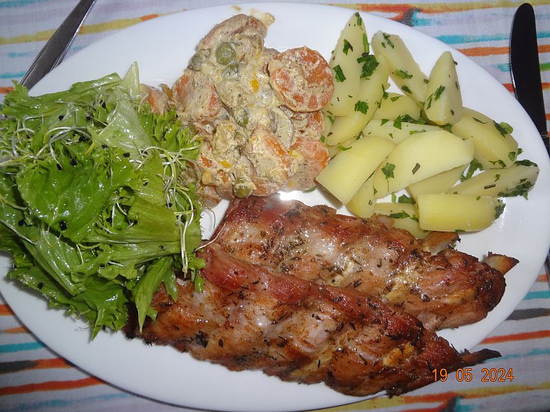 | | Glasierte Schweine-Rippchen aus dem Ofen, Bratkartoffeln, Eichblatt-Salat mit Sprossen, Ahornsirup, Zitronensaft, Leinöl |